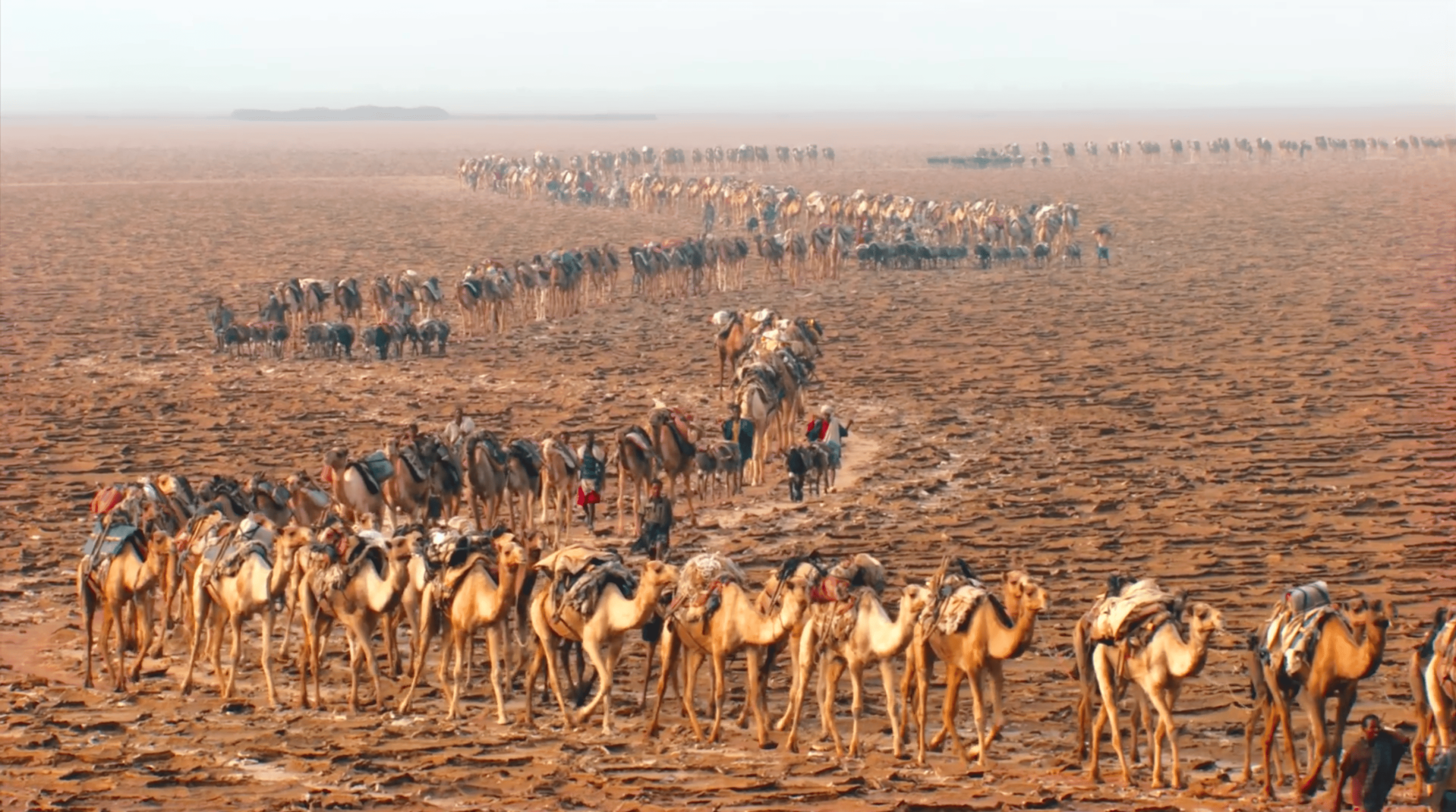 The Ancient Trade: Lake Assale & The Salt Caravans The Danakil is also a place of incredible human endurance. Lake Assale (Lake Karum) is a vast, shimmering salt pan that stretches toward the horizon in a blinding white sheet. For centuries, the Afar people have braved these temperatures to mine “white gold.” Using only traditional hand tools, they cut uniform blocks of salt from the earth. You will witness the legendary camel caravans, where hundreds of camels are tethered together to carry these salt blocks back to the highlands—a trade route that has remained virtually unchanged for over a thousand years.